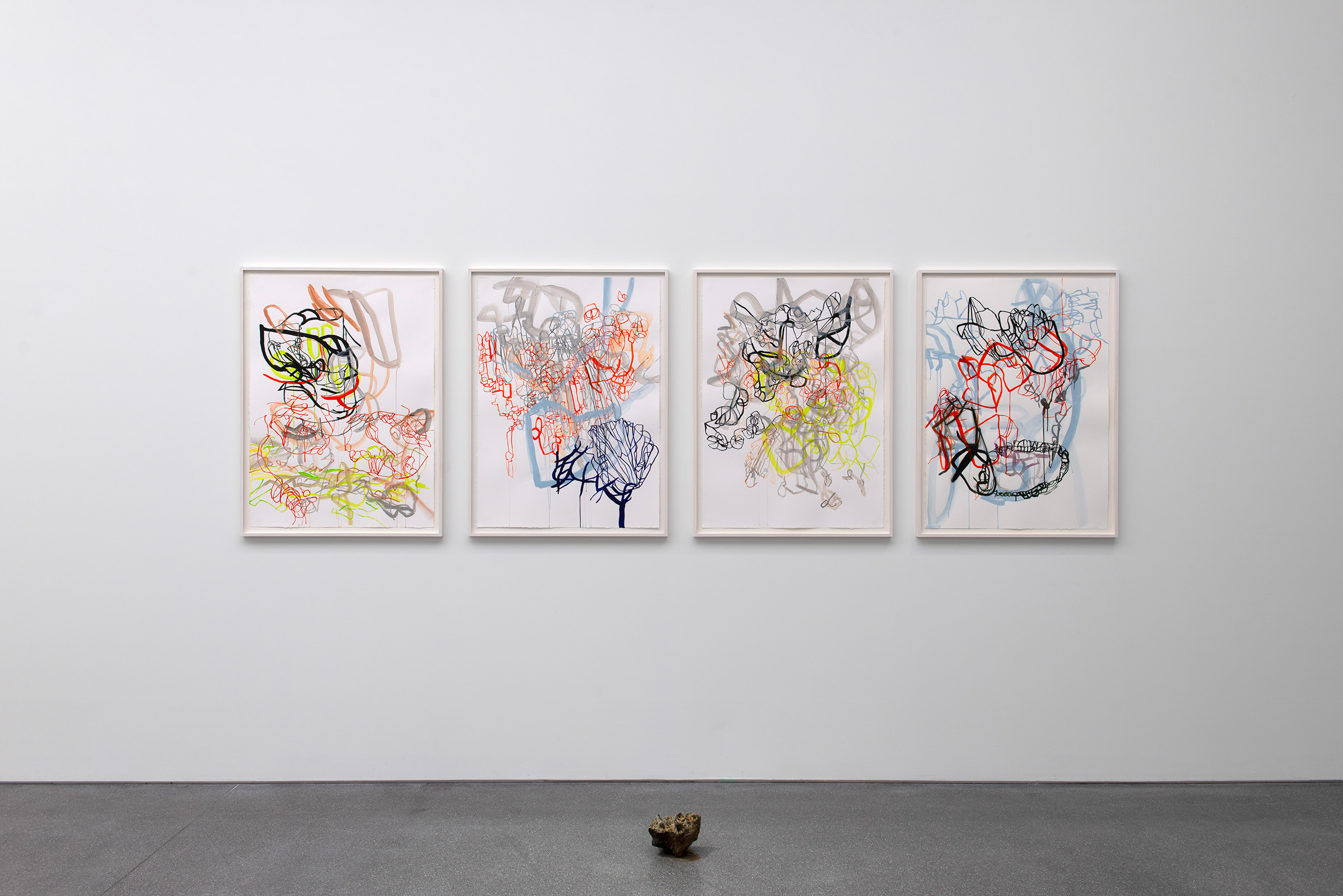 Die Künstlerin beschreibt das Erstellen ihrer Tuschezeichnungen als eine Felswanderung ohne Seil, bei der der Fokus auf dem Moment liegt und gleichzeitig die Spuren vergangener Zeiten sichtbar werden.